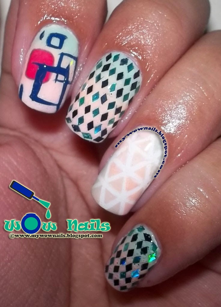 So my NOTD has 3 different designs, first i did a sponged gradient on my pointer, middle, and pinkie to serve as a base. What i did to my pointer is a simple abstract design, and on my middle and pinkie i used some of my holographic black and aqua rhombus glequins, when i decided to do this design, i think it will be the easiest to do but i was wrong, it's the hardest of them all, hahaha... i applied them on my nail one by one using the ever reliable toothpick, haha! and last but not the least my pastel triangles, i used some stripping tape to serve as a guide and sponged some pastel polish over my taped nails.